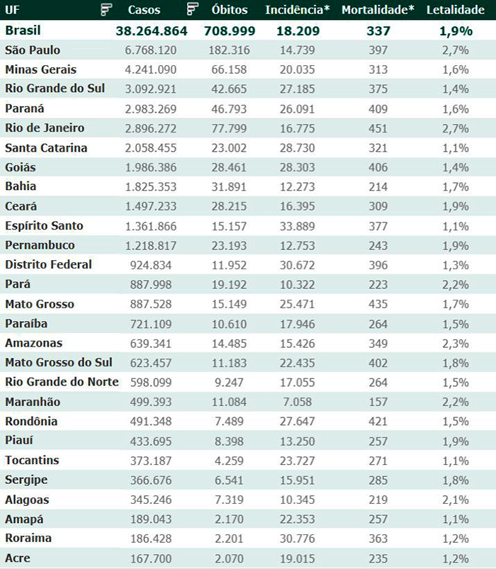 As secretarias estaduais de Saúde contabilizaram, desde o início da pandemia, em todo o país 38.264.864 diagnósticos positivos e 708.999 mortes em decorrência da Covid-19.