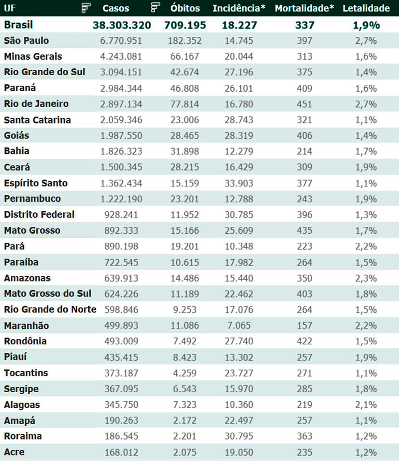 As secretarias estaduais de Saúde contabilizaram, desde o início da pandemia, em todo o país 38.303.320 diagnósticos positivos e 709.195 mortes em decorrência da Covid-19.