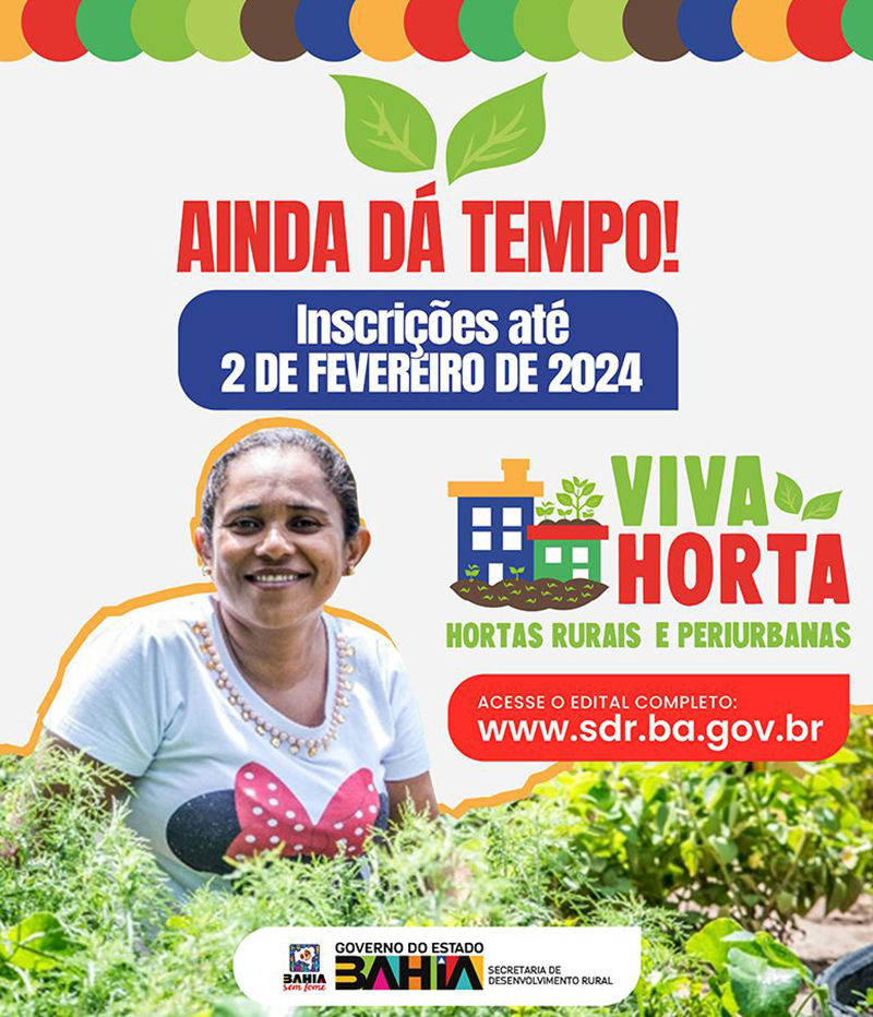 O prazo de inscrições para o edital Viva Horta se encerra nesta sexta-feira (2). O edital da Secretaria de Desenvolvimento Rural (SDR) tem o objetivo de implantar hortas comunitárias rurais e periurbanas nos Territórios de Identidade da Bahia, promovendo a segurança alimentar e a geração de renda para as famílias envolvidas.