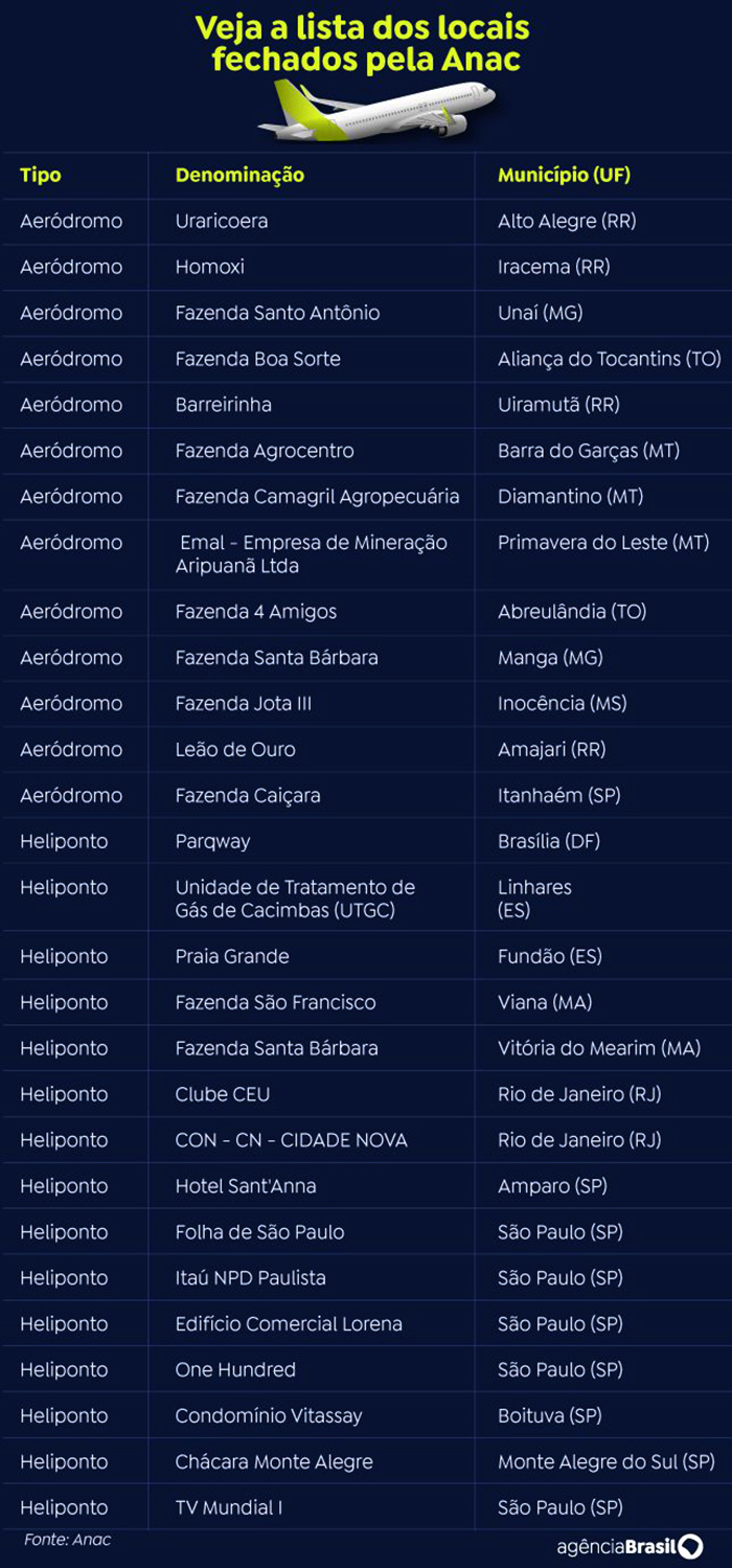 Anac fecha 28 aeroportos e helipontos privados no Brasil. Arte Agência Brasil