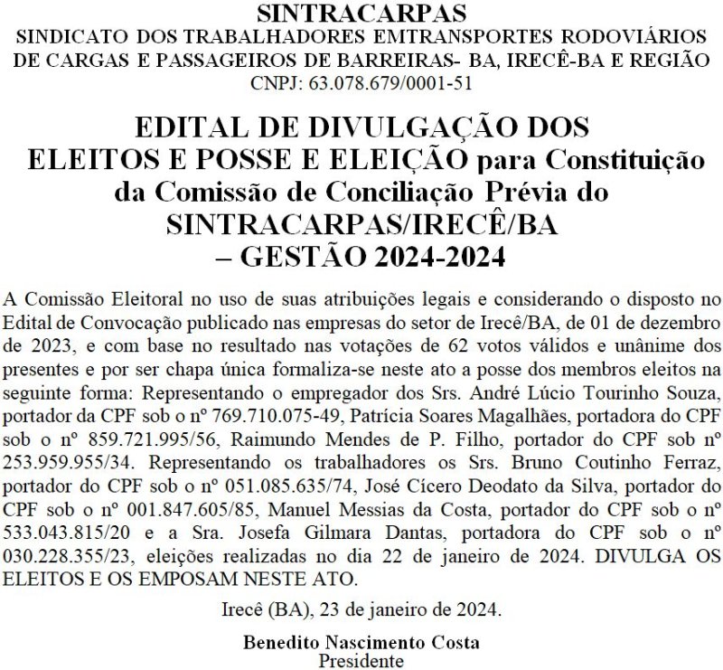 SINTRACARPAS - EDITAL DE DIVULGAÇÃO DOS ELEITOS E POSSE E ELEIÇÃO para Constituição da Comissão de Conciliação Prévia do SINTRACARPAS/IRECÊ/BA – GESTÃO 2024-2024