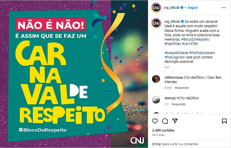 Até 17 de fevereiro, a mobilização digital busca conscientizar e prevenir situações de assédio e outras violências, durante as festividades. A iniciativa está focada na segurança e bem-estar dos foliões durante o carnaval e as postagens divulgam frases como “Respeito, Diversidade e Inclusão, com esse trio a diversão está garantida”.
