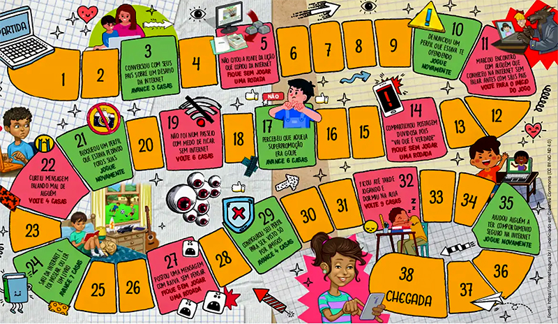 disponível no site da Internet Segura, e então recortar e montar um dado e alguns personagens disponíveis no jogo. Depois, basta jogar esse dado e ir pulando as casas correspondentes até chegar ao destino final. Se, no caminho, você cair em uma casa de comportamento arriscado na internet, terá que voltar uma casa ou ficar sem jogar. Ganha o jogo quem tiver um comportamento mais seguro na internet e conseguir chegar primeiro ao ponto final.