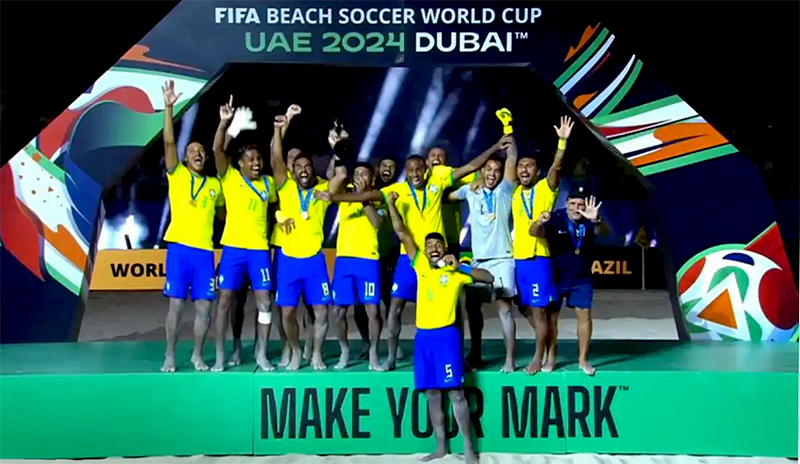O Brasil é hexacampeão mundial de futebol de areia. O título, com uma campanha de 100% de aproveitamento, foi confirmado no início da tarde deste domingo (25) com a vitória por 6 a 4 sobre a Itália, em Dubai, nos Emirados Árabes.