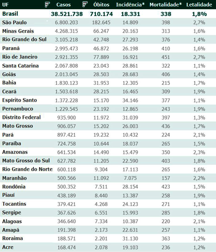 As secretarias estaduais de Saúde contabilizaram, desde o início da pandemia, em todo o país 38.521.738 diagnósticos positivos e 710.174 mortes em decorrência da Covid-19.