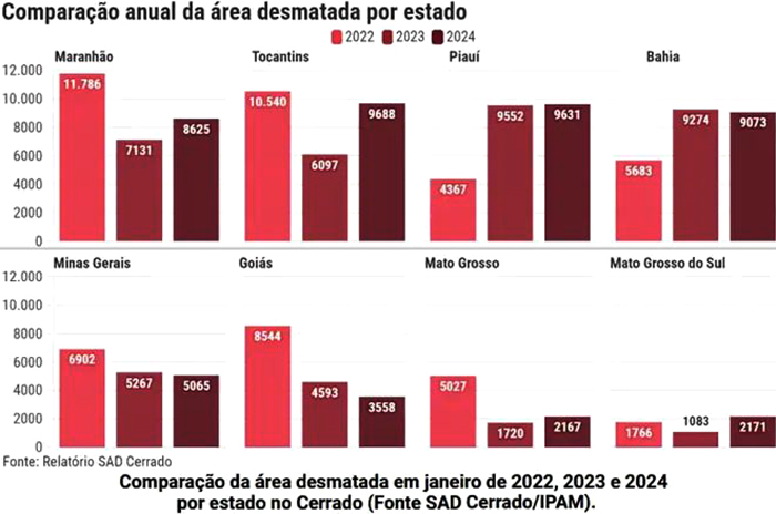 No topo do ranking do desmatamento em janeiro estão os estados do Tocantins e Piauí, ambos em torno dos 10 mil hectares de vegetação suprimida. No caso do Tocantins, o aumento foi de 40% em relação a janeiro de 2023. Em seguida, estão os estados da Bahia e do Maranhão, ambos em torno dos 9 mil hectares de Cerrado desmatados.