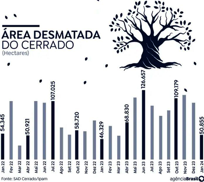 A coordenadora do SAD Cerrado do Ipam, Fernanda Ribeiro, destacou que, mesmo se for levada em consideração a redução do desmatamento de dezembro de 2023 para janeiro de 2024, não é possível concluir que haja uma tendência consistente de queda da derrubada do Cerrado.