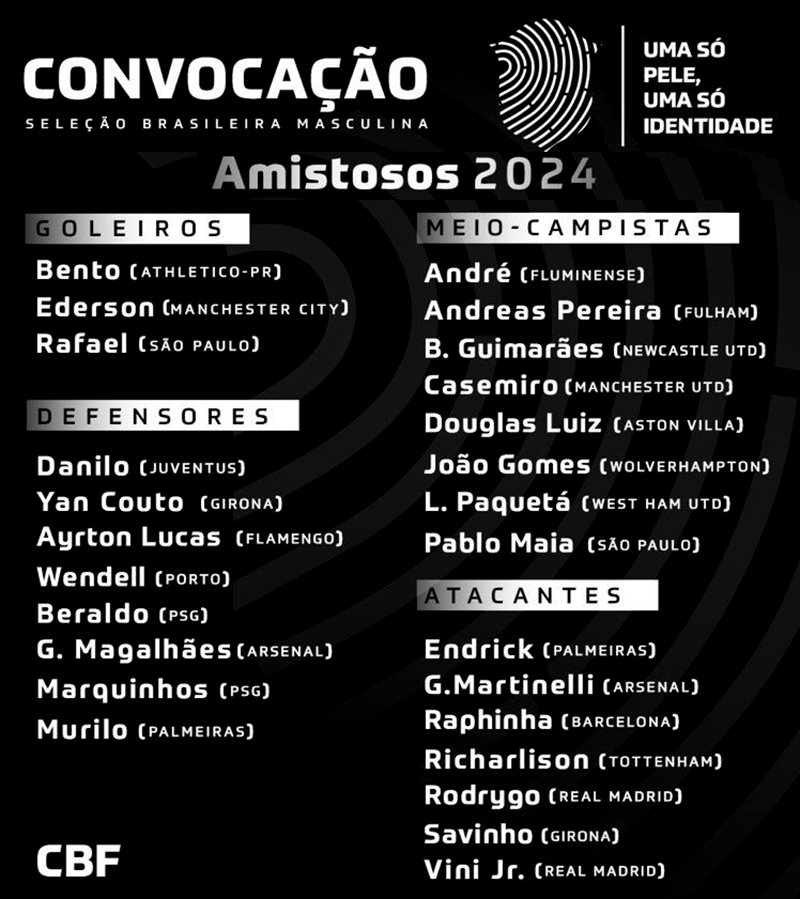 Quem está de volta à seleção é o meio-campista Lucas Paquetá (West Ham/Inglaterra), que não veste a amarelinha desde junho. Ele seria convocado em agosto passado pelo então técnico-interino Fernando Diniz, mas ficou ausente na lista devido à uma investigação sobre manipulação de apostas esportivas na Grã-Bretanha.