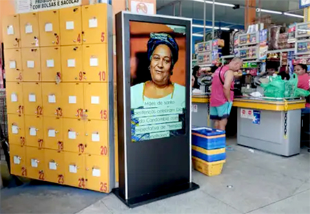 Totem usado para distribuir notícias por mídias periféricas, instalado em supermercado no distrito do Jaraguá, zona noroeste de São Paulo. Foto: Alexandro Silva |