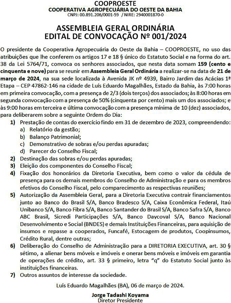 COOPROESTE_ASSEMBLEIA GERAL ORDINÁRIA - EDITAL DE CONVOCAÇÃO Nº 001/2024