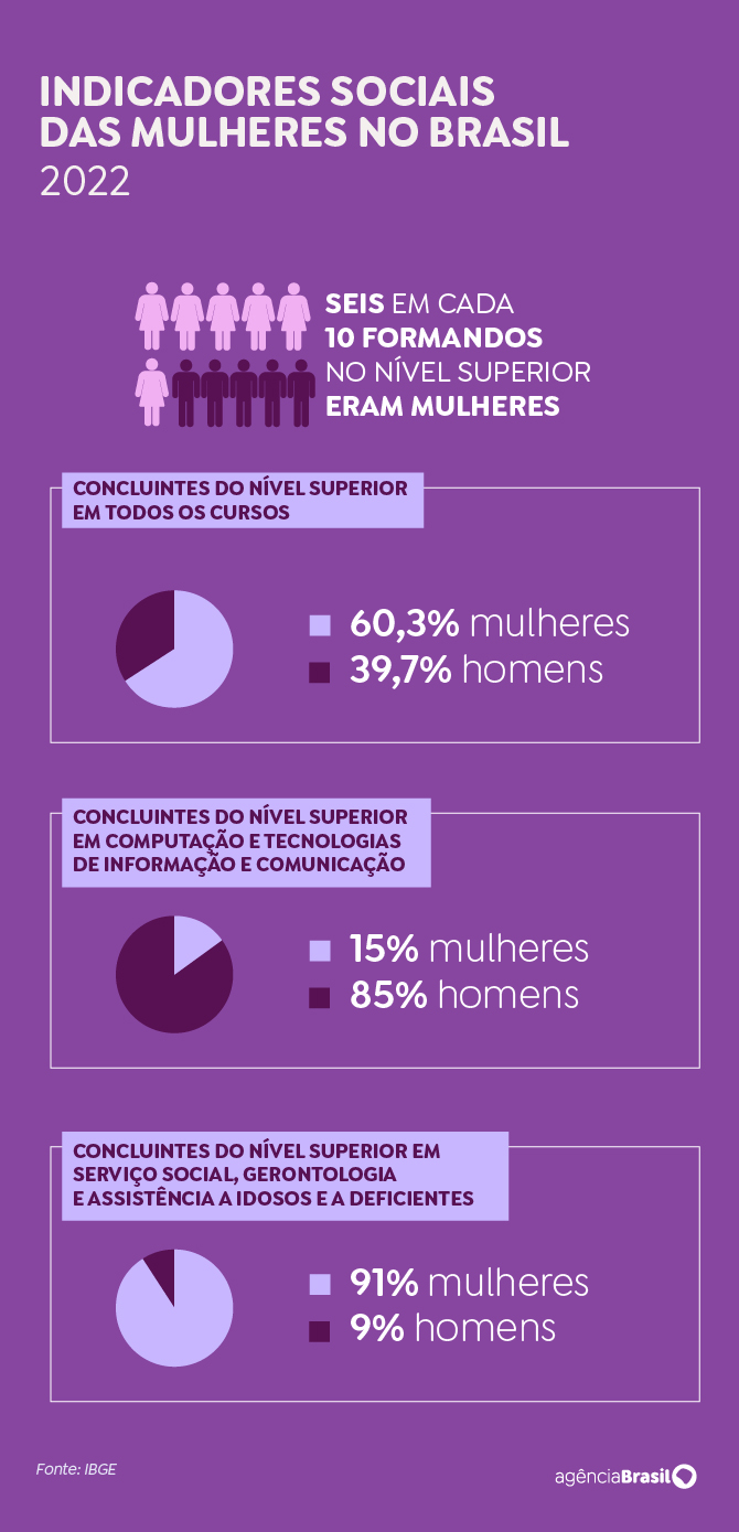 Nos cursos de ciência e tecnologia, que incluem as áreas de ciência, tecnologia da informação, matemática, estatística e engenharia, as mulheres são apenas 22% dos concluintes.