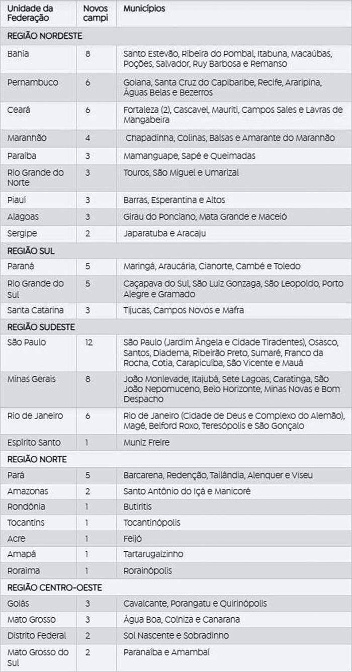 Confira lista completa dos 100 novos campi:
