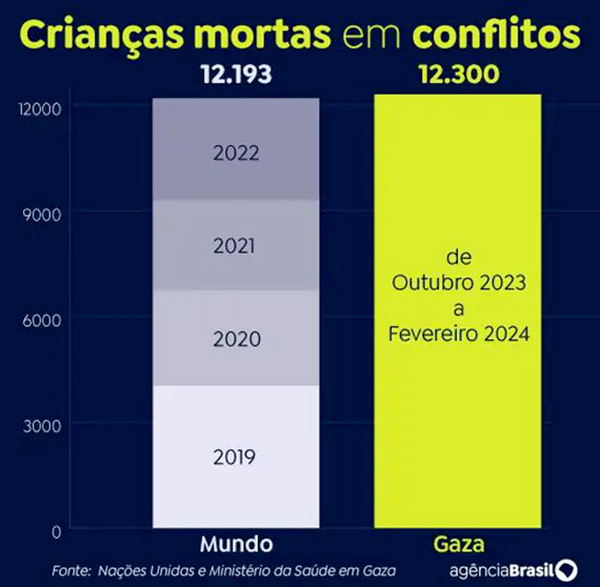 O número de crianças mortas na Faixa de Gaza em 4 meses de guerra, de outubro de 2023 a fevereiro de 2024, superou o total de crianças mortas em todas as guerras do mundo durante 4 anos, de 2019 a 2022. Os números foram compilados pela Organização das Nações Unidas (ONU), que calcula que