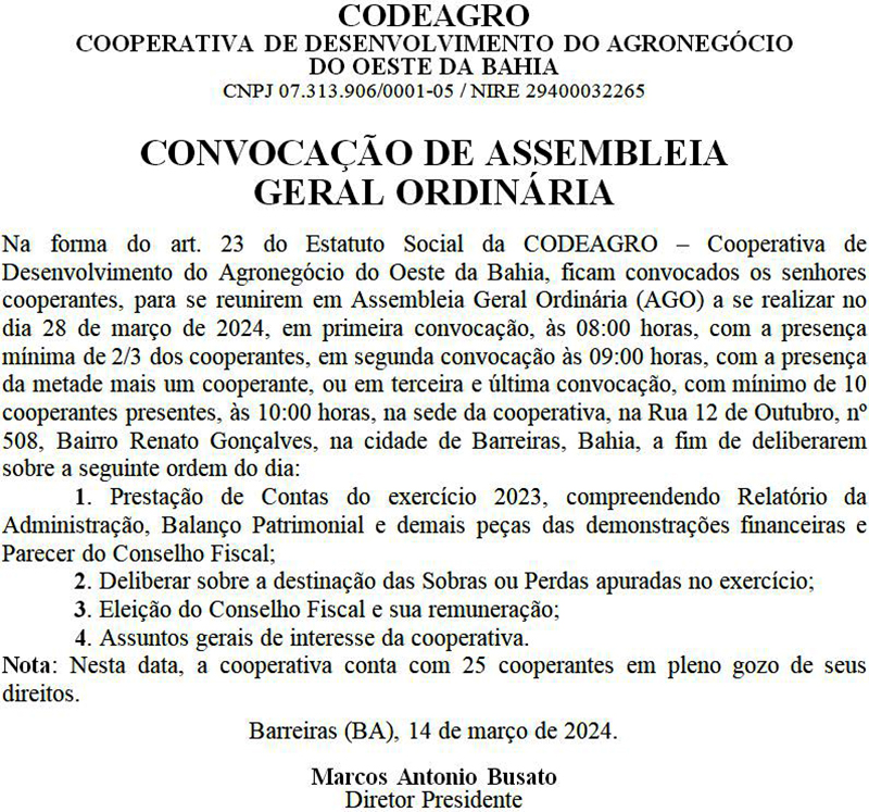 CODEAGRO_CONVOCAÇÃO DE ASSEMBLEIA GERAL ORDINÁRIA