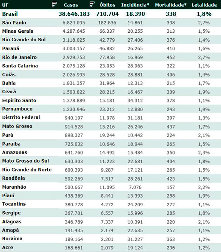 As secretarias estaduais de Saúde contabilizaram, desde o início da pandemia, em todo o país 38.646.183 diagnósticos positivos e 710.704 mortes em decorrência da Covid-19.