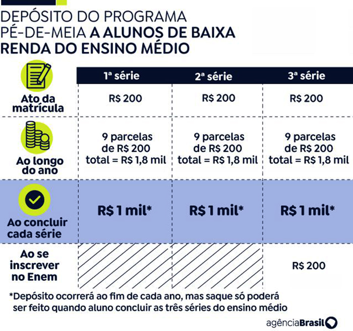 O programa Pé-de-Meia é um incentivo financeiro-educacional, pago na modalidade de poupança, aos estudantes matriculados no ensino médio público. A política prevê o pagamento de incentivos anuais de até R$ 3 mil por beneficiário (conforme arte abaixo). Ao final da etapa de ensino, nos três anos, o valor pode atingir R$ 9.200 para cada estudante. Ele foi criado em janeiro deste ano pela