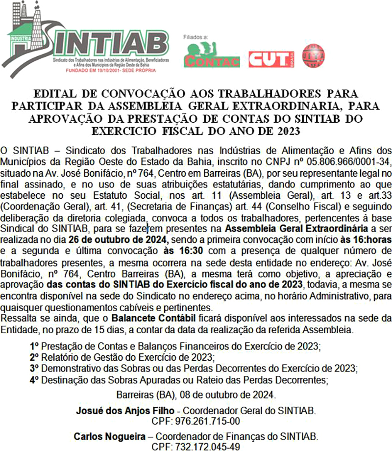 SINTIAB - EDITAL DE CONVOCAÇÃO AOS TRABALHADORES PARA PARTICIPAR DA ASSEMBLEIA GERAL EXTRAORDINARIA, PARA APROVAÇÃO DA PRESTAÇÃO DE CONTAS DO SINTIAB DO EXERCICIO FISCAL DO ANO DE 2023