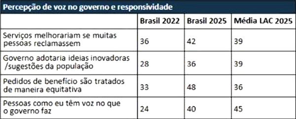 Outro dado significativo diz respeito à percepção de igualdade no acesso a benefícios públicos. Neste tema, 48% dos brasileiros afirmam que os pedidos são tratados de forma justa, um aumento de 15 pontos percentuais em relação a 2022 e acima da média regional, que é de 36%.