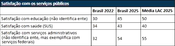A pesquisa também aponta avanços na percepção dos cidadãos sobre a qualidade dos serviços públicos. A avaliação de que os serviços públicos administrativos atendem melhor à população cresceu 22 pontos percentuais entre 2022 e 2025, chegando a 54%. A satisfação com a educação pública (45%) aumentou 15 pontos percentuais, sendo o maior avanço registrado entre os países da região, enquanto a satisfação com o Sistema Único de Saúde (SUS) cresceu onze pontos (44%), posicionando o Brasil acima da média latino-americana.