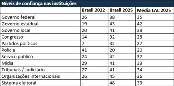 Entre os destaques do levantamento está o fato de que o Brasil é, em 2025, o país com maior nível de confiança no sistema eleitoral em toda a América Latina, com índice de 48%, nove pontos acima da média regional. A confiança no serviço público praticamente dobrou no período, alcançando 45%, o que representa 10 pontos acima da média latino-americana.