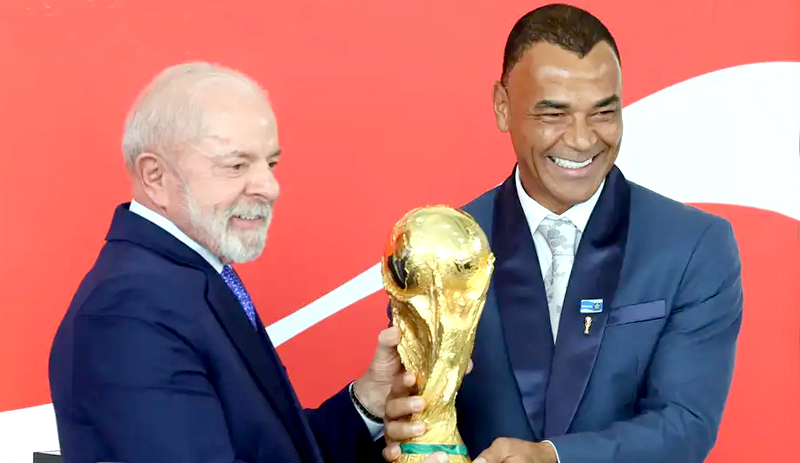 O presidente Luiz Inácio Lula participou no dia de ontem, quinta-feira (26), da cerimônia oficial Tour da Taça da Copa do Mundo da Fifa 2026, no Palácio do Planalto. Ex-jogadores de futebol, como Cafu, Jairzinho, Branco, Edmílson, Pepe e a ex-atleta Formiga, da Seleção Feminina, também estiveram presentes no evento, além de ministros e outras autoridades.