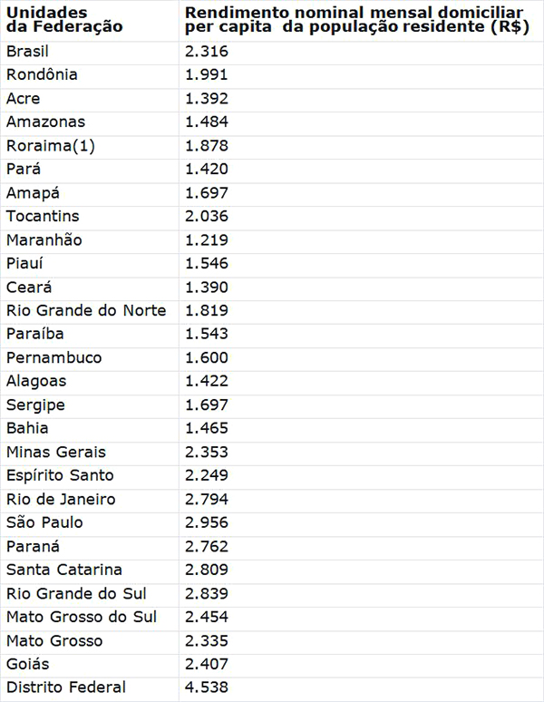 Entre as unidades da federação, esse valor variou de R$ 1.219 no Maranhão a R$ 4.538 no Distrito Federal. Nove estados e o DF superaram o rendimento médio nacional.