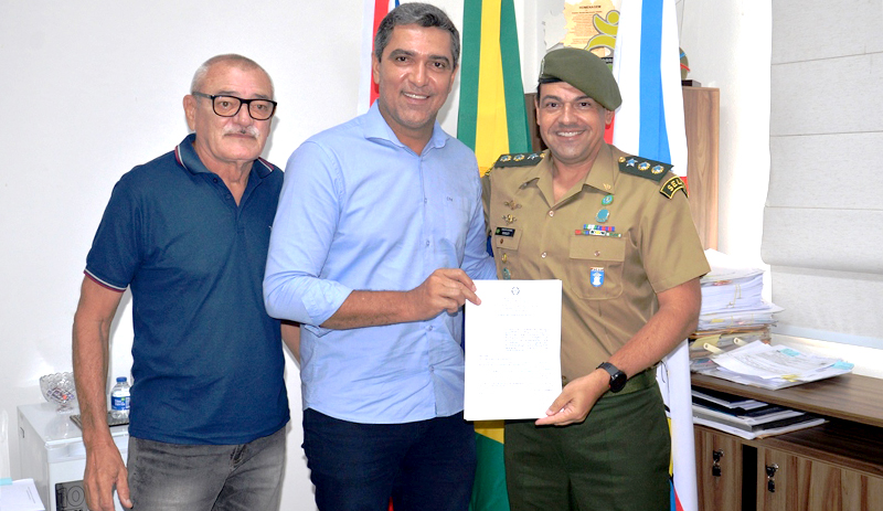 O prefeito Otoniel Teixeira, recebeu nesta sexta-feira (6), em seu gabinete, o comandante do 4º Batalhão de Engenharia de Construção (4º BEC), tenente-coronel Warley Luiz da Silva, para a assinatura do convênio que garante a continuidade do Programa Forças no Esporte (PROFESP) no município. A iniciativa possibilita que estudantes da rede municipal participem de atividades esportivas e educativas realizadas no batalhão, no contraturno escolar. Também participaram do encontro o gestor do projeto, capitão José Luiz Sena de Lima, e o 1º sargento Vinícius Bosco Schiavi de Carvalho.