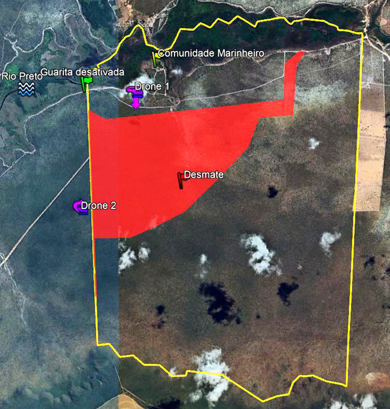 Drone 01, no sentido da Comunidade Marinheiro (margem direita do rio Preto) em relação a serra; drone 02, no sentido leste x oeste, obseva-se o correntão/Reprodução/Google/Divulgação
