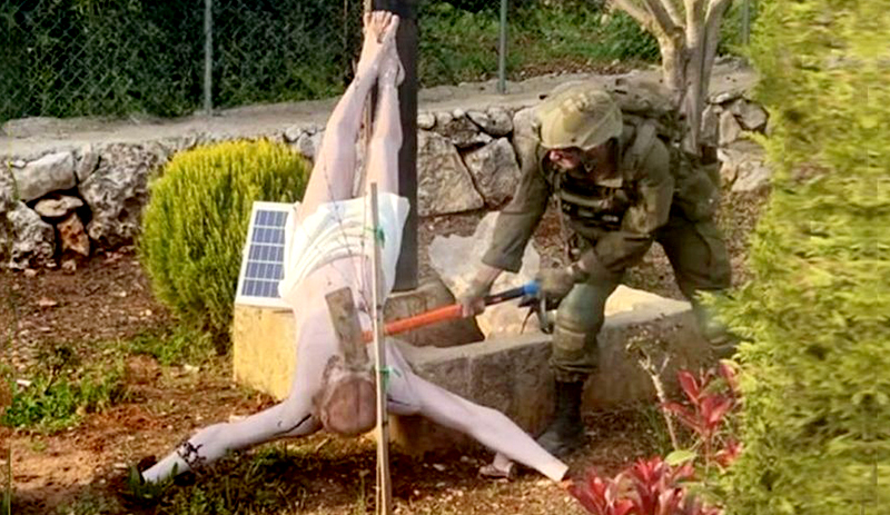 Soldado israelense vandalizando imagem de Jesus Cristo