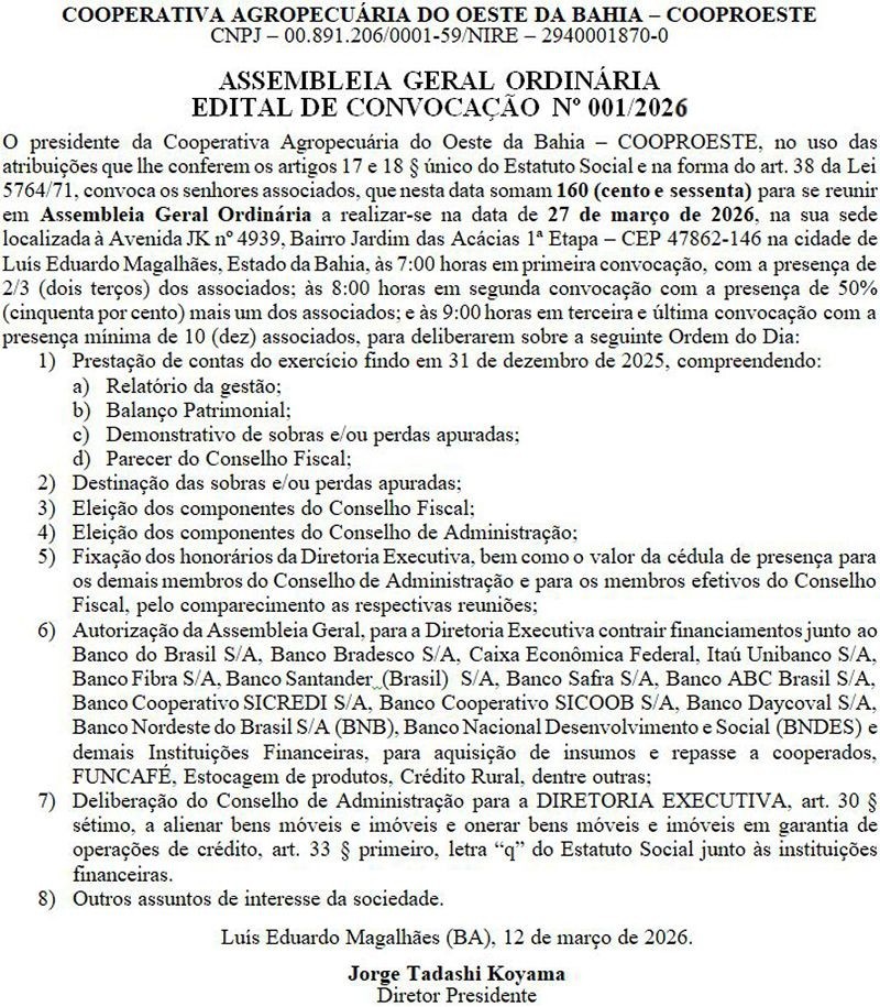 COOPROESTE - ASSEMBLEIA GERAL ORDINÁRIA - EDITAL DE CONVOCAÇÃO Nº 001/2026