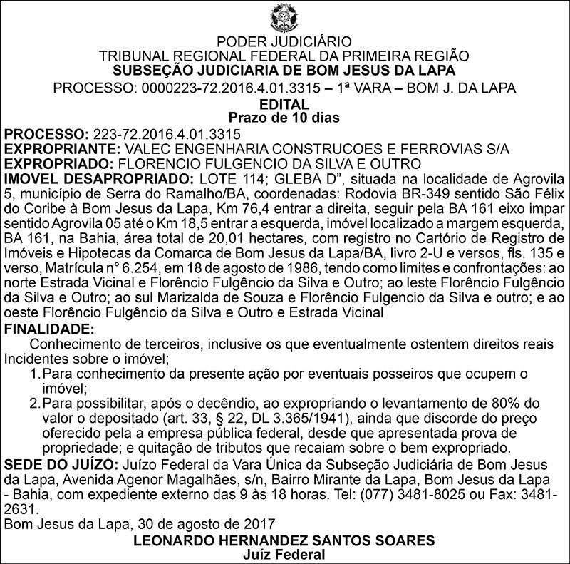 JUSTIÇA FEDERAL - SUBSEÇÃO JUDICIÁRIA DE BOM JESUS DA LAPA (BA) - EDITAL DE DESAPROPRIAÇÃO - FLORENCIO FULGENCIO DA SILVA E OUTRO - LOTE 114, GLEBA D, AGROVILA 5, NO MUNICÍPIO DE SERRA DO RAMALHO - BAHIA