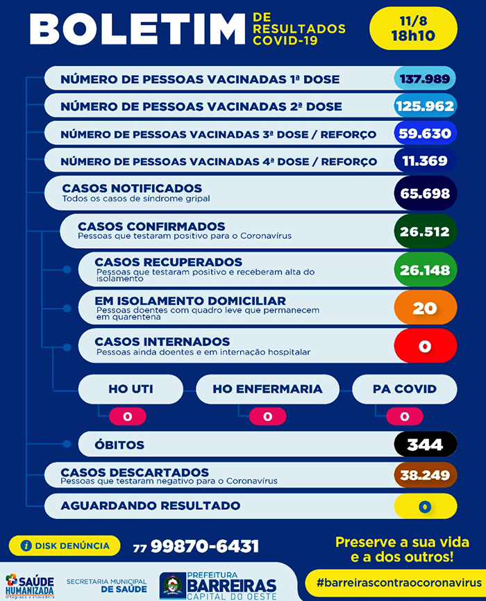 Boletim Informativo Coronavírus (COVID-19) nº 740, de 11/08/2022 - A Prefeitura de Barreiras, por meio da Secretaria de Saúde, informa a situação epidemiológica do município. Desde o Boletim Nº 739, de 08 de agosto de 2022, não houve coletas de novas amostras de casos que indicam suspeição de coronavírus (Covid-19).