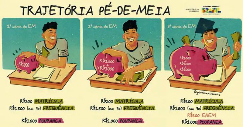 O Pé-de-Meia prevê o pagamento de incentivo mensal de R$ 200, que pode ser sacado em qualquer momento, além dos depósitos de R$ 1.000 ao final de cada ano concluído, que só poderão ser retirados da poupança após a conclusão do ano letivo. Se consideradas as dez parcelas de incentivo, os depósitos anuais e, ainda, o adicional de R$ 200 pela participação no Exame Nacional do Ensino Médio (Enem) na última série, os valores podem chegar a R$ 9.200 por aluno.
