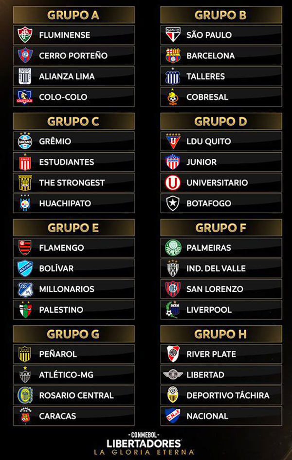 Fluminense, atual campeão, caiu no Grupo A, junto com Cerro Porteño (Paraguai), Alianza Lima (Peru) e Colo-Colo (Chile). A