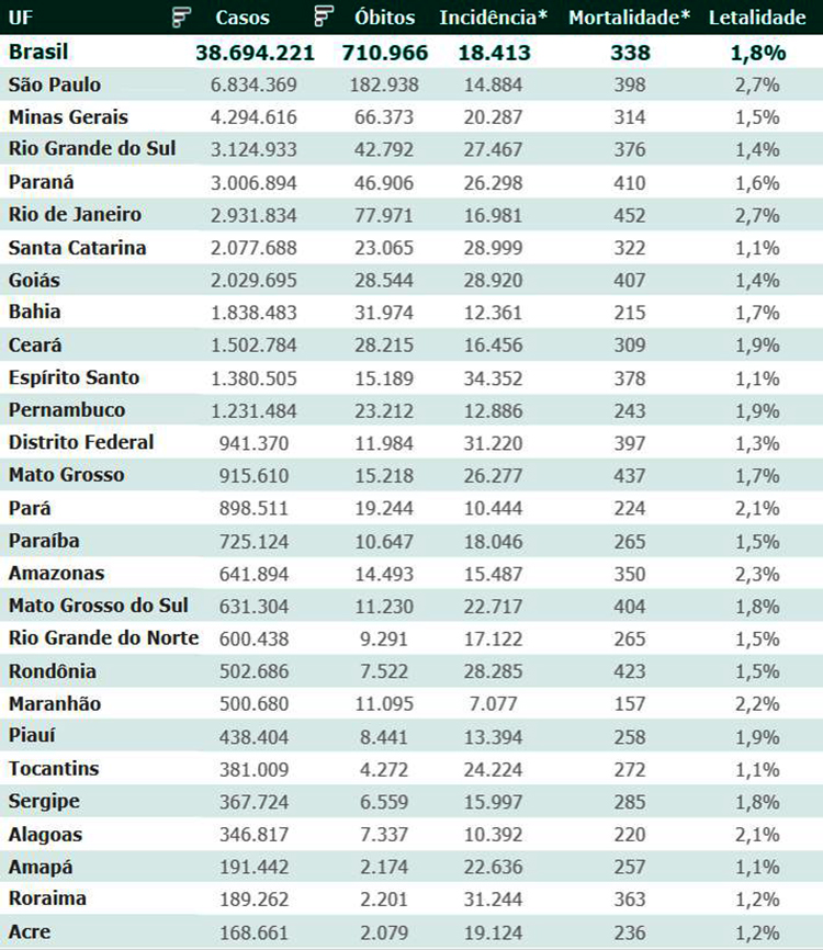 As secretarias estaduais de Saúde contabilizaram, desde o início da pandemia, em todo o país 38.694.221 diagnósticos positivos e 710.966 mortes em decorrência da Covid-19.