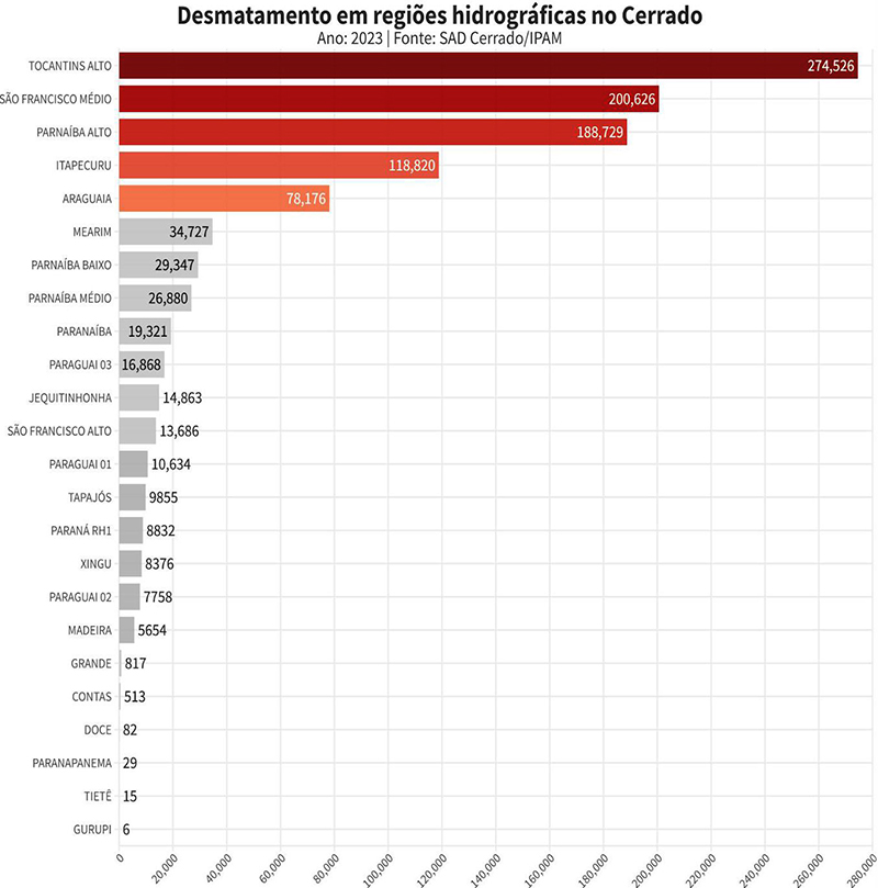 Na bacia do Tocantins Alto, segunda maior do bacia do Cerrado e a mais desmatada em 2023 no bioma, foram perdidos 274 mil hectares de vegetação nativa - 26% de tudo que foi perdido em 2023. A bacia abriga as nascentes do Rio Tocantins, segundo maior território brasileiro e serve como uma rota comercial fundamental para o escoamento e irrigação da produção agrícola na região central do País.