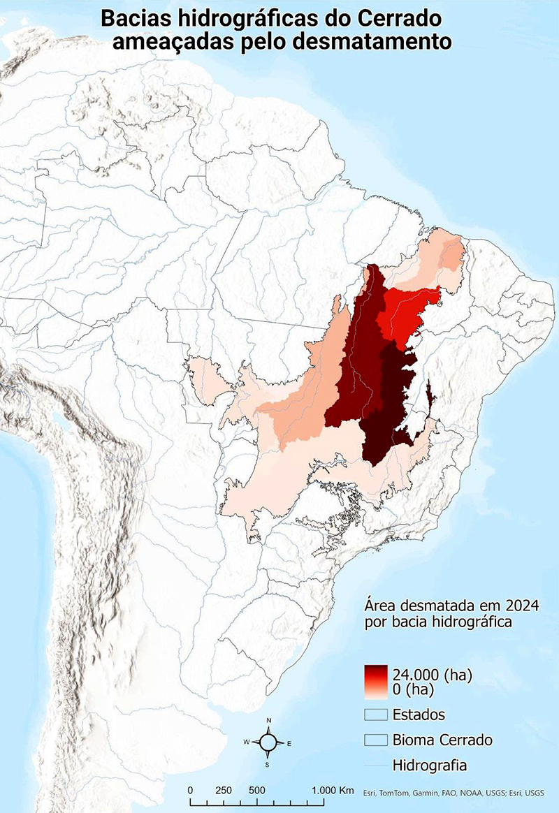 Em relação às bacias hidrográficas, o cenário se repete no primeiro bimestre de 2024. Nos dois primeiros meses do ano o Cerrado já acumulou 89 mil hectares desmatados. Desse total, 83% estão concentrados em cinco das vinte e quatro bacias hidrográficas do Cerrado (São Francisco Médio com 24 mil hectares; Tocantins Alto com 22 mil hectares; Parnaíba Alto com 15 mil hectares; Parnaíba Baixo com 6 mil hectares e Araguaia com 5 mil hectares desmatados).