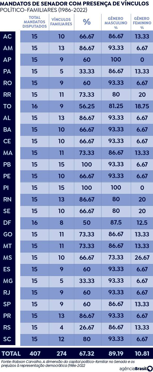 Dos 407 mandatos disputados nesse período, 274 deles, o equivalente a 67% dos cargos, foram ocupados por pessoas com vínculos familiares com políticos já eleitos. Com isso, os senadores acabam herdando o capital político da família e se elegem apoiados pelo sobrenome. Esse levantamento é parte da pesquisa do cientista político Robson Carvalho, doutorando da Universidade de Brasília (UnB).