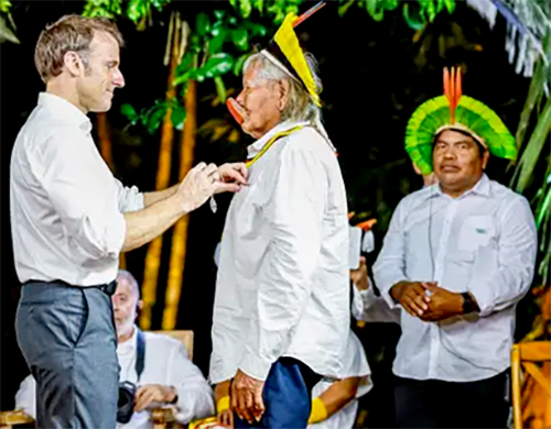 O cacique Raoni Metuktire, líder do povo kayapó e um dos representantes indígenas mais reconhecidos internacionalmente, foi condecorado ontem, terça-feira (26), em Belém, com a ordem do cavaleiro da Legião de Honra da França. Entregue pelo presidente francês, Emmanuel Macron, a medalha é a maior honraria concedida pela França aos seus cidadãos e a estrangeiros que se destacam por suas atividades no cenário global.