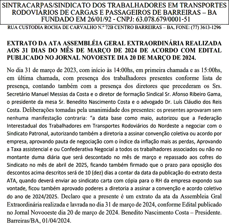 SINTRACARPAS_EXTRATO DA ATA ASSEMBLEIA GERAL EXTRAORDINÁRIA