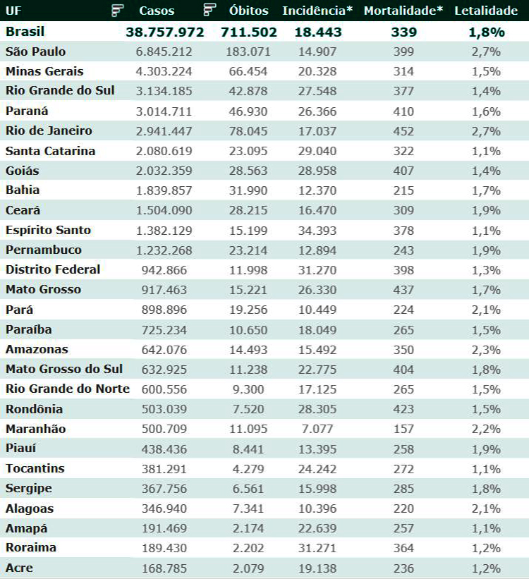 As secretarias estaduais de Saúde contabilizaram, desde o início da pandemia, em todo o país 38.757.972 diagnósticos positivos e 711.502 mortes em decorrência da Covid-19.