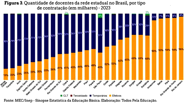A proporção de docentes temporários e efetivos varia de acordo com a unidade federativa do país. No ano passado, 15 dessas unidades tinham mais professores temporários que efetivos e, ao longo da década, 16 aumentaram o número de professores temporários e diminuíram o quadro de concursados.