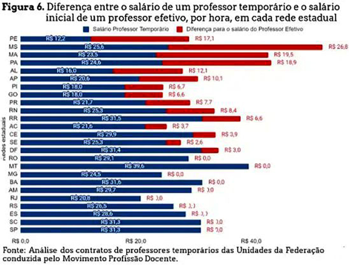 Em 15 redes de ensino, o estudo mostra que o salário dos professores temporários, calculados por hora, é menor que o de professores efetivos em início de carreira, chegando a uma diferença de até 140%, no caso de Pernambuco. Nas outras dez redes analisadas, não há diferença.