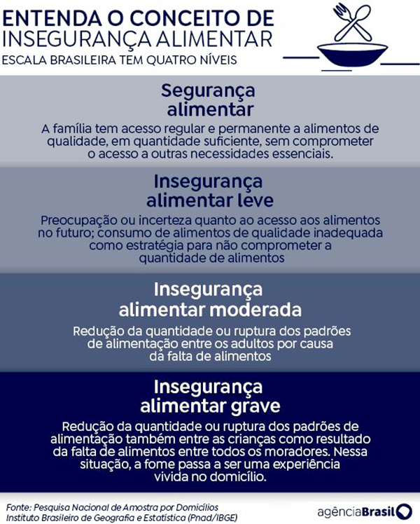Já a insegurança alimentar moderada atinge 4,2 milhões de famílias (11,9 milhões de pessoas) e demonstra redução quantitativa de alimentos entre os adultos e/ou ruptura nos padrões de alimentação resultante da falta de alimentos entre os adultos.