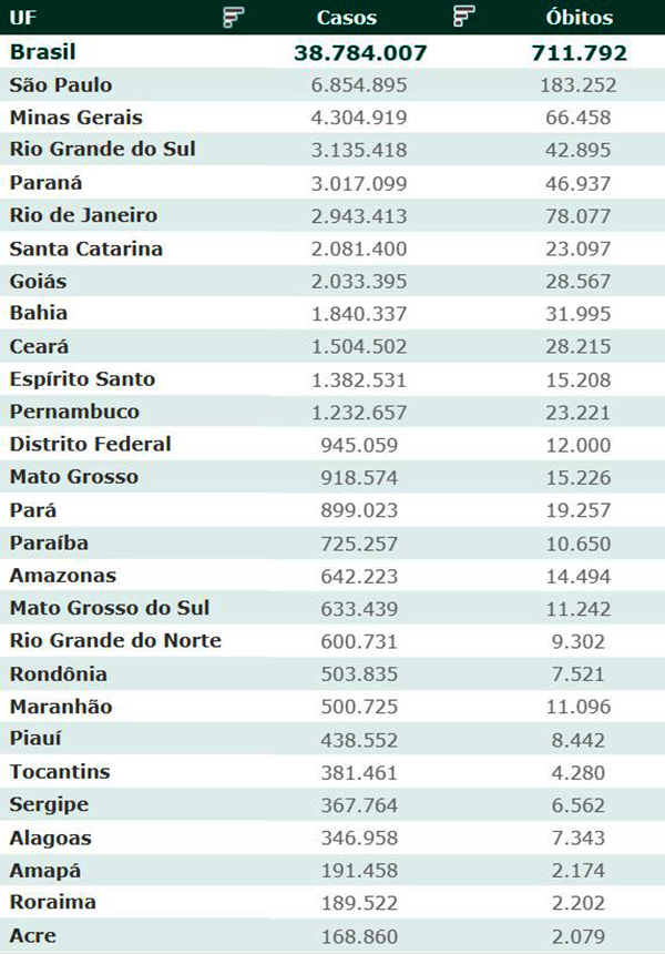 As secretarias estaduais de Saúde contabilizaram, desde o início da pandemia, em todo o país 38.784.007 diagnósticos positivos e 711.792 mortes em decorrência da Covid-19.