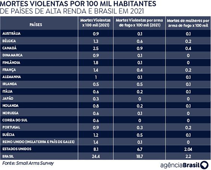 Dados mais recentes indicam que a diferença continua. A reportagem comparou as taxas de mortes violentas, de mortes violentas por armas de fogo e morte de mulheres por arma de fogo entre Estados Unidos e países de renda alta, incluindo o Brasil para comparação. Os dados da tabela abaixo são da