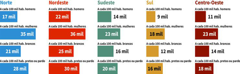 Quando o recorte se baseia na cor/raça, as pessoas pretas ou pardas “lideram” no Nordeste, sendo 28 mil a cada 100 mil habitantes pretos ou pardos da região. Em seguida, o Norte aparece com 26 mil pessoas a cada 100 mil habitantes pretas ou pardas, 18 mil a cada 100 habitantes neste recorte no Sudeste, 16 mil a cada 100 mil habitantes no Centro-Oeste e, por fim, o Sul que tem somente 13 mil habitantes pretos ou pardos categorizados como “Nem-nem” a cada 100 mil habitantes.