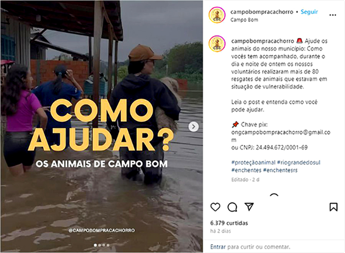 Outra organização que tem atuado no resgate e cuidado de cães e gatos ilhados é a Campo Bom pra Cachorro, que fica no município de Campo Bom (RS), na região metropolitana de Porto Alegre. De acordo com a ONG, eles resgataram 80 animais em um único dia, chegando ao total de 200 animais retirados da água pelos voluntários.