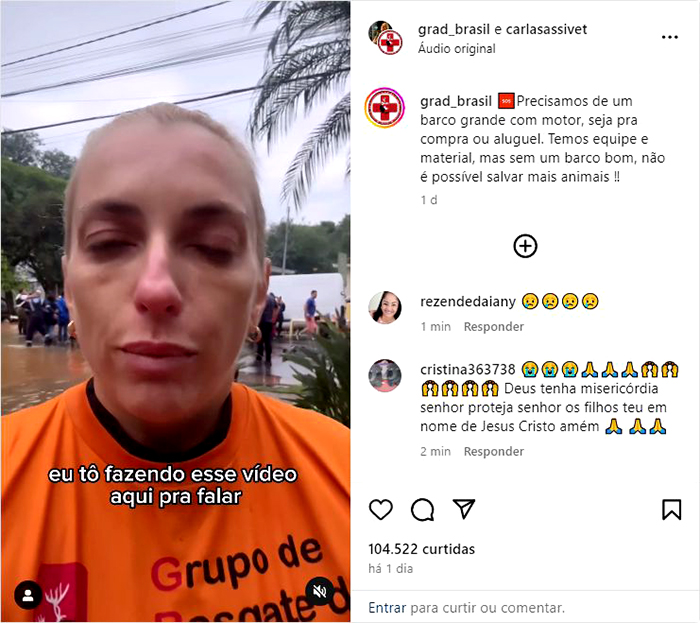 Os pedidos por resgates não param de chegar, mas muitas áreas continuam inacessíveis. Precisamos aumentar nossa equipe a campo e estamos solicitando apoio de embarcações a motor para salvar o maior número de animais possível”, afirmou, em nota, a