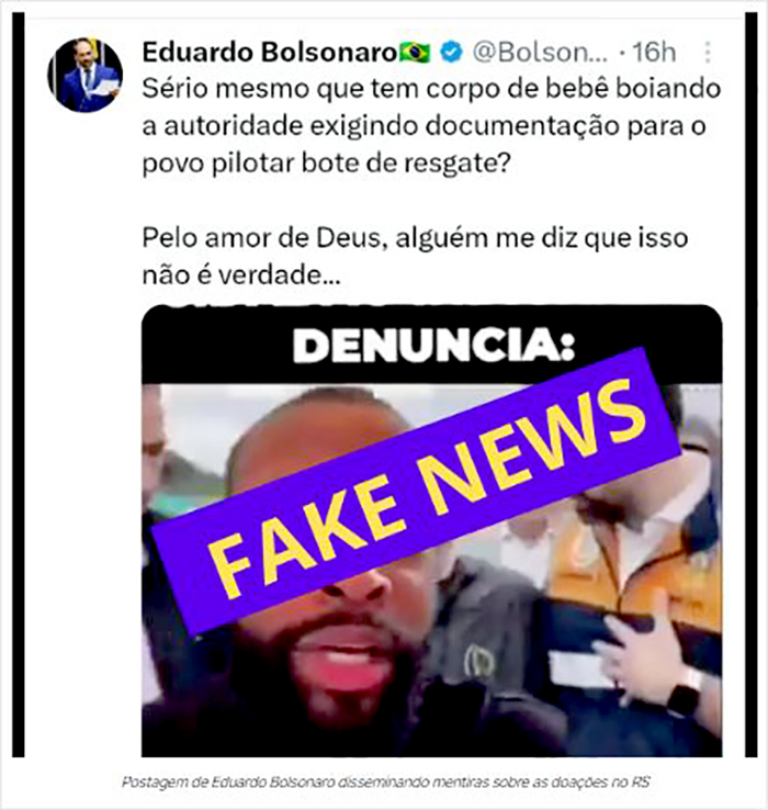 Em seu perfil na rede social X, Eduardo Bolsonaro postou vídeo em que um homem faz afirmações falsas sobre a exigência de notas fiscais para doações, junto com um texto: “Sério mesmo que tem corpo de bebê boiando a autoridade exigindo documentação para o povo pilotar bote de resgate? Pelo amor de Deus, alguém me diz que isso não é verdade…”